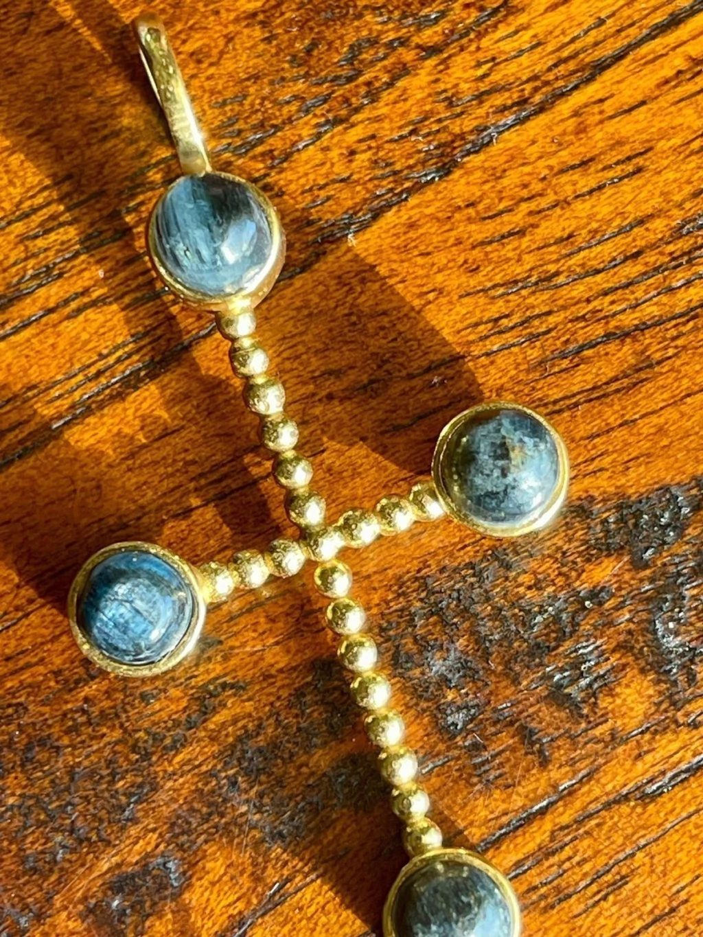 Diseño: En las cuatro puntas de la cruz lleva piedra redonda kyanite, una piedra natural que potencia la intuición y la confianza