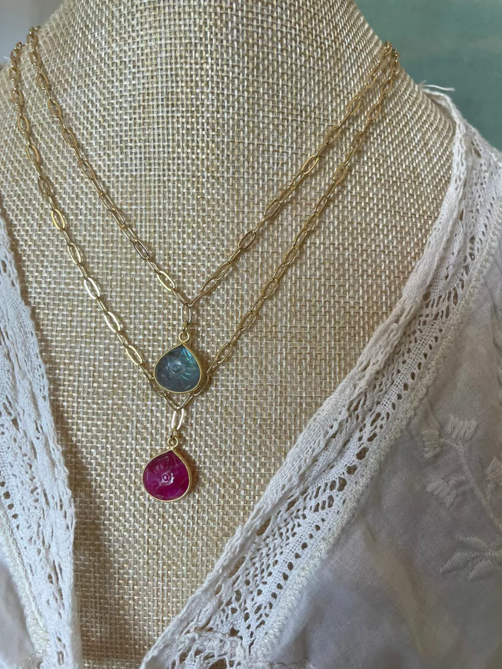 Dije (sin cadena) en forma de gota de 1,4 cm. En dos variantes onix azul, y rubi