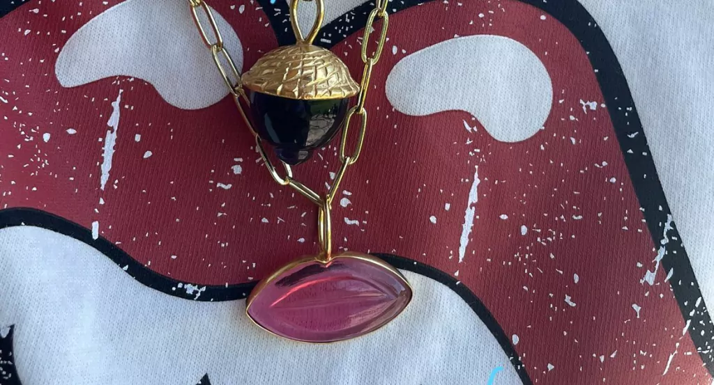 Piedra natural de turmalina rosa, totalmente protagonizada dentro del diseño tallada a mano en forma de labios con borde y loop bañados en oro que aportan brillo y elegancia.